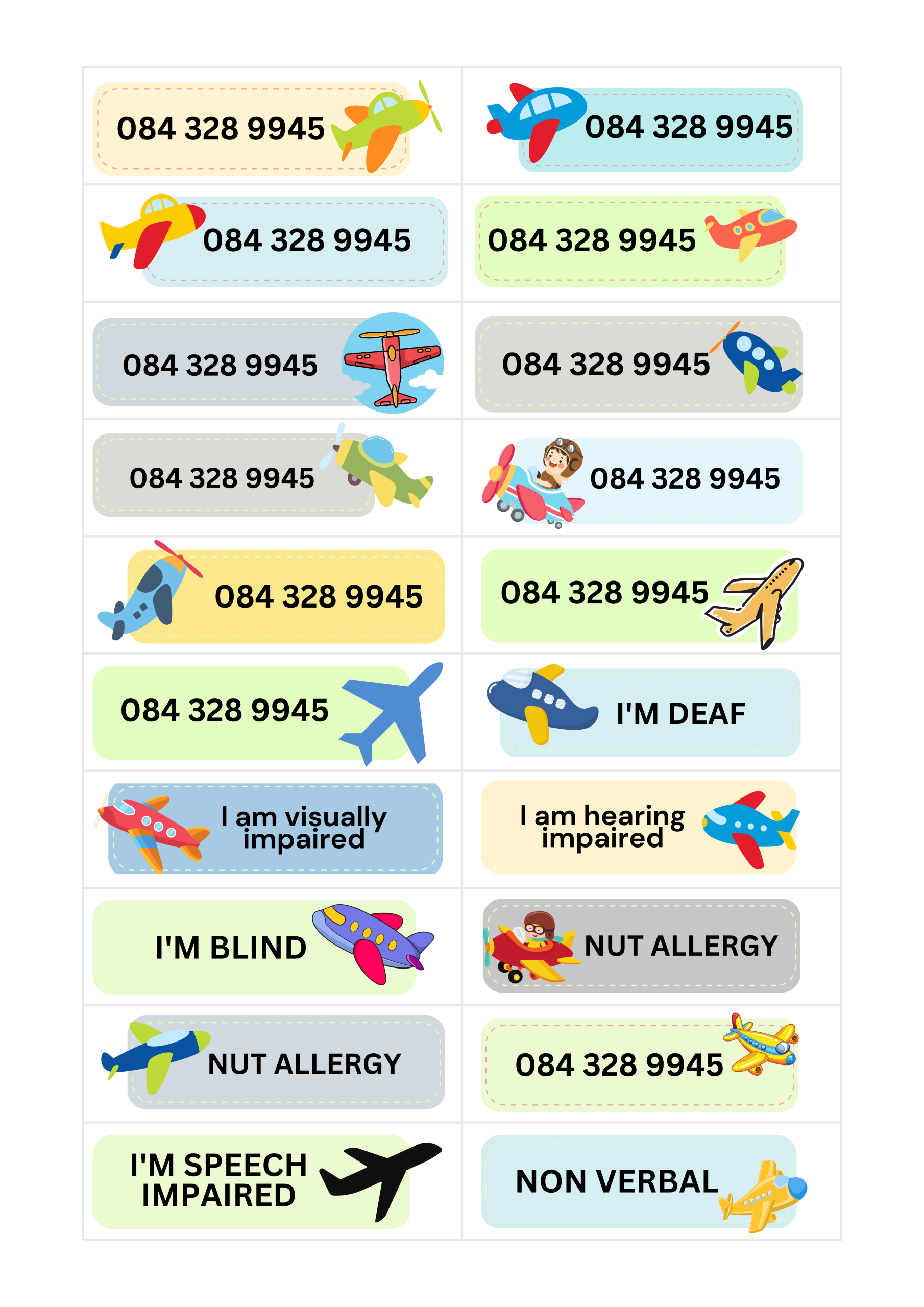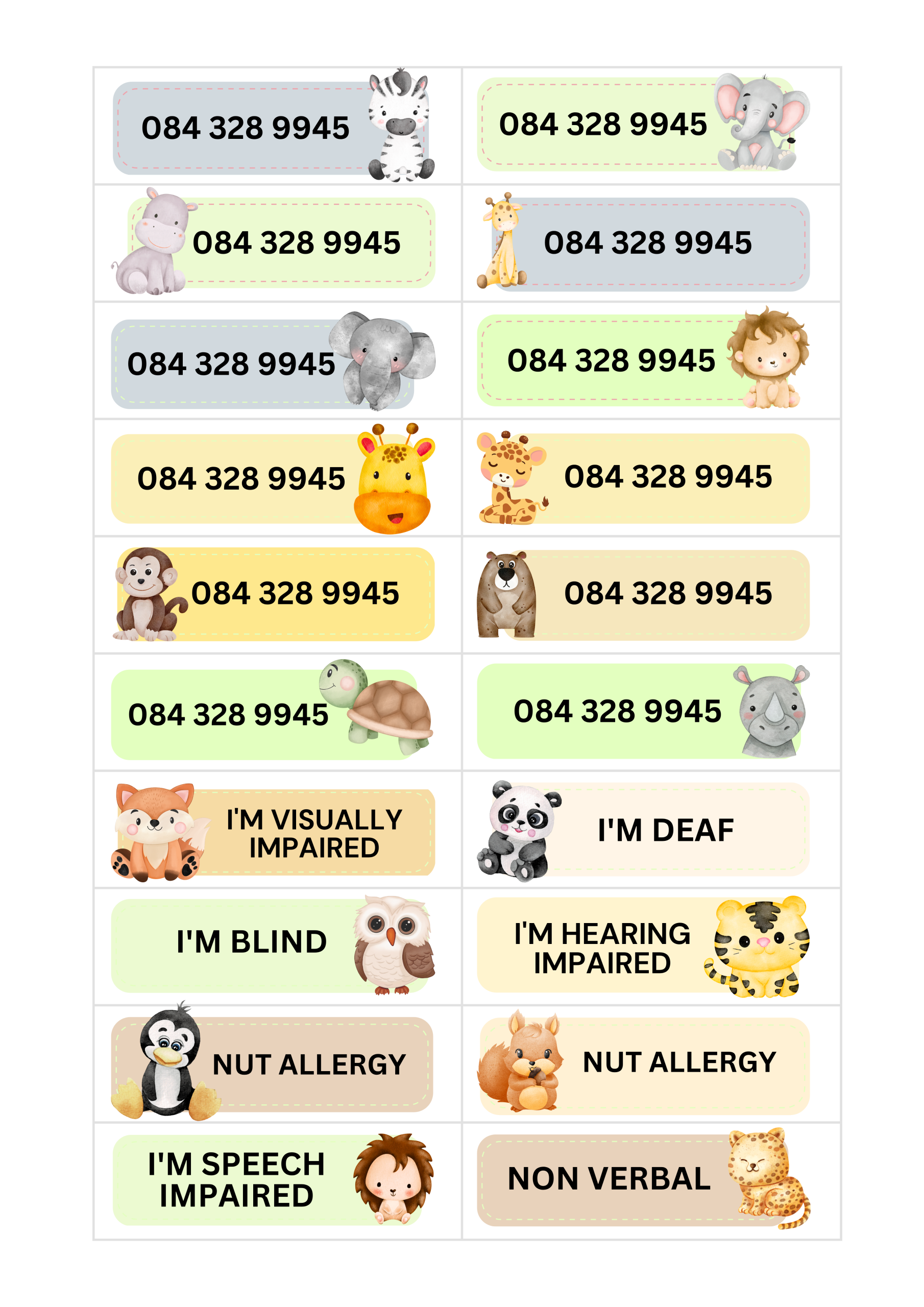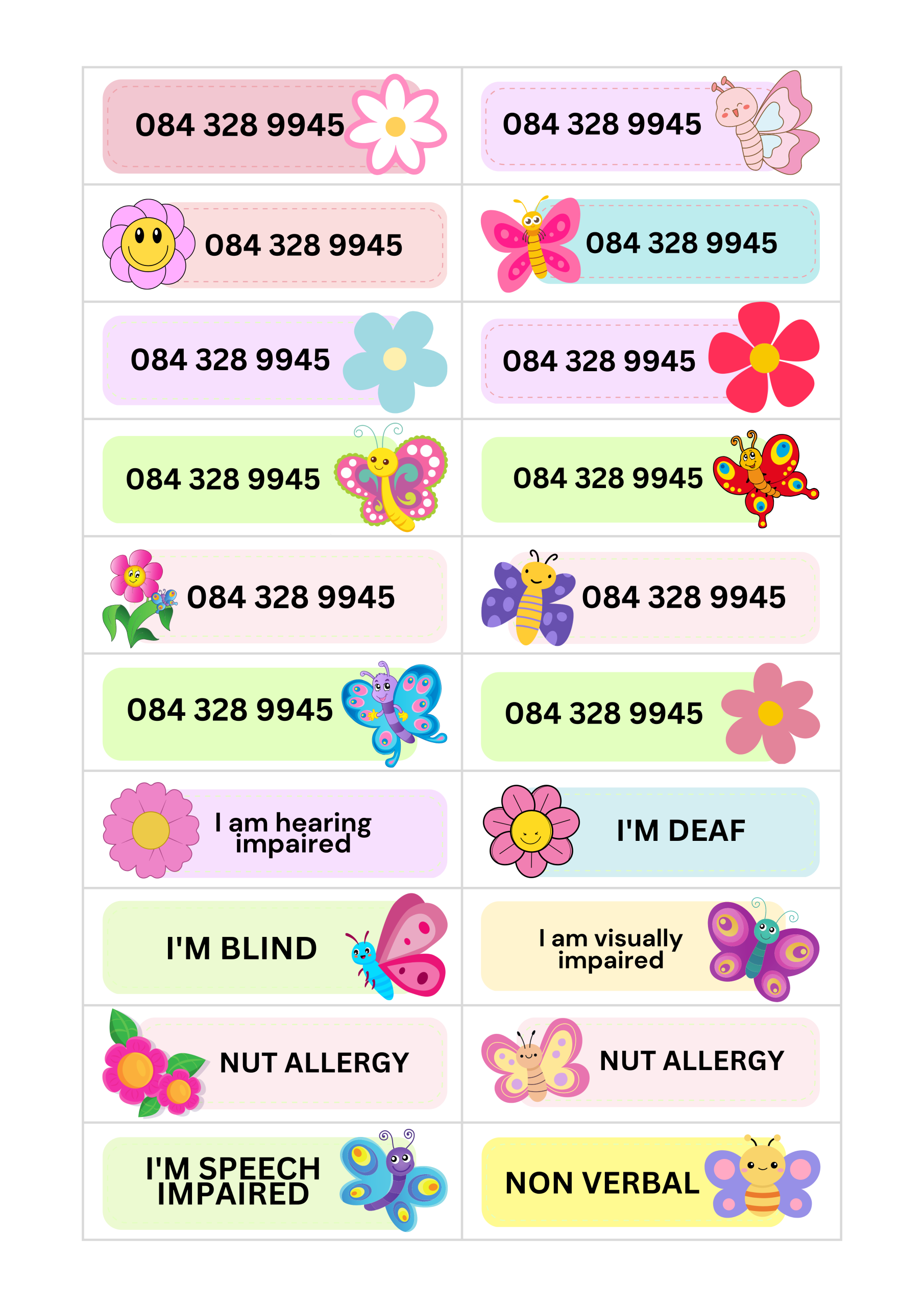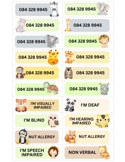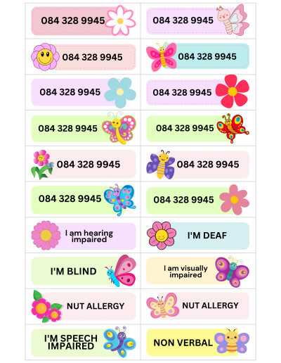Worried about your child wandering or being unable to communicate in public? KidzInfo temporary tattoos provide a simple, effective solution. Designed for young children or children with special needs that do not know their parents’ contact number. These tattoos display important information such as your phone number or messages such as “I’m nonverbal”, while letting your child enjoy a fun theme.